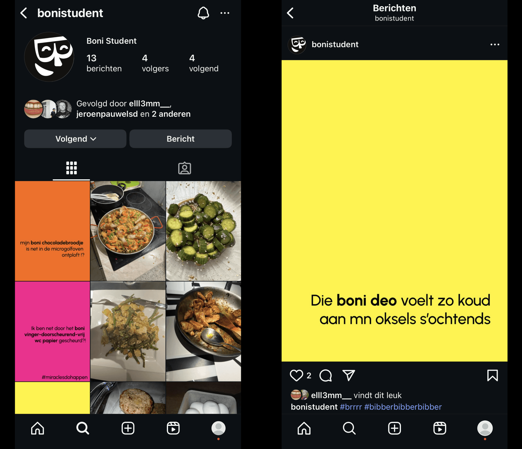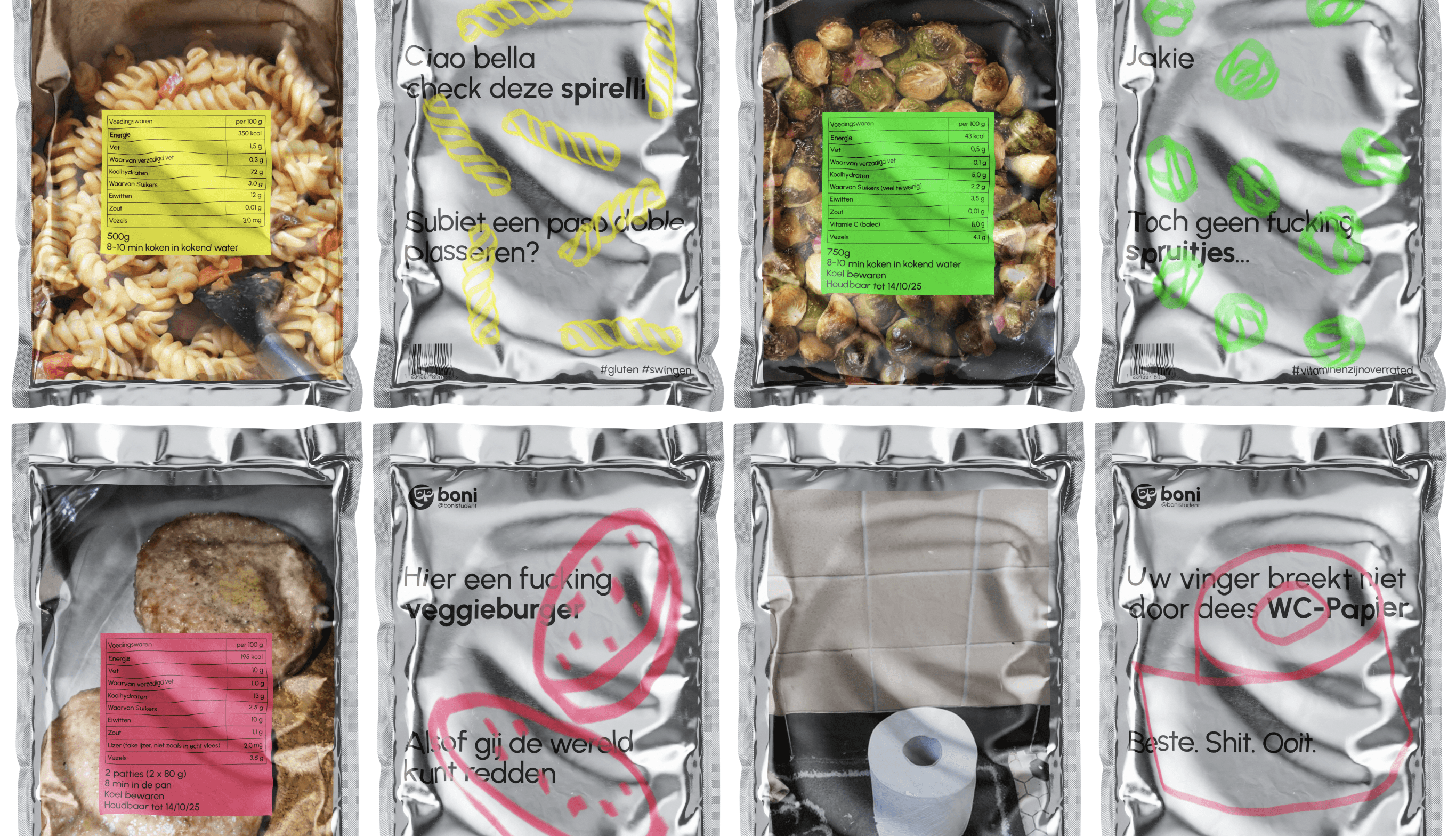 We were given a (fictional) brief from LUCA School of Arts to rebrand Boni, the private label of Colruyt Group. But young people don’t really need a Boni rebrand. Most of them are still living at home and rarely do their own grocery shopping. Students living in dorms, on the other hand, do. However, they’re not buying laundry detergent blocks or other irrelevant products. That’s why, together with Alec Antoine and Jens Jaecques, I’m introducing Boni Student: a new selection within the Boni range, specifically designed for student living. We curated 100 products from the Boni assortment that are most relevant to them. We fully ignored the original briefing and chose to focus on what we believed the brand actually needed most. In our final presentation, they were extremely happy with the result and it opened their eyes to a different direction for the brand. We posted our project on LinkedIn and it went viral with 15.000 impressions, sparking a lot of excitement. Many people assumed it was a real upcoming launch, and were disappointed to later discover it was fictional, which we clarified in the description. Boni knows exactly what you need as a student. It’s your best mate. It’s more than a private label, it’s a home label. And now, also a student label.